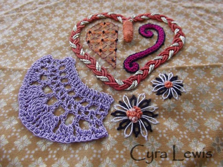 Then added the heart outline, latticework, another crochet shape, buttons, beads and French Knots etc.
